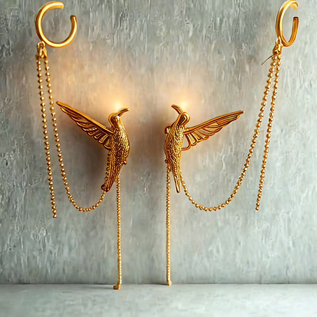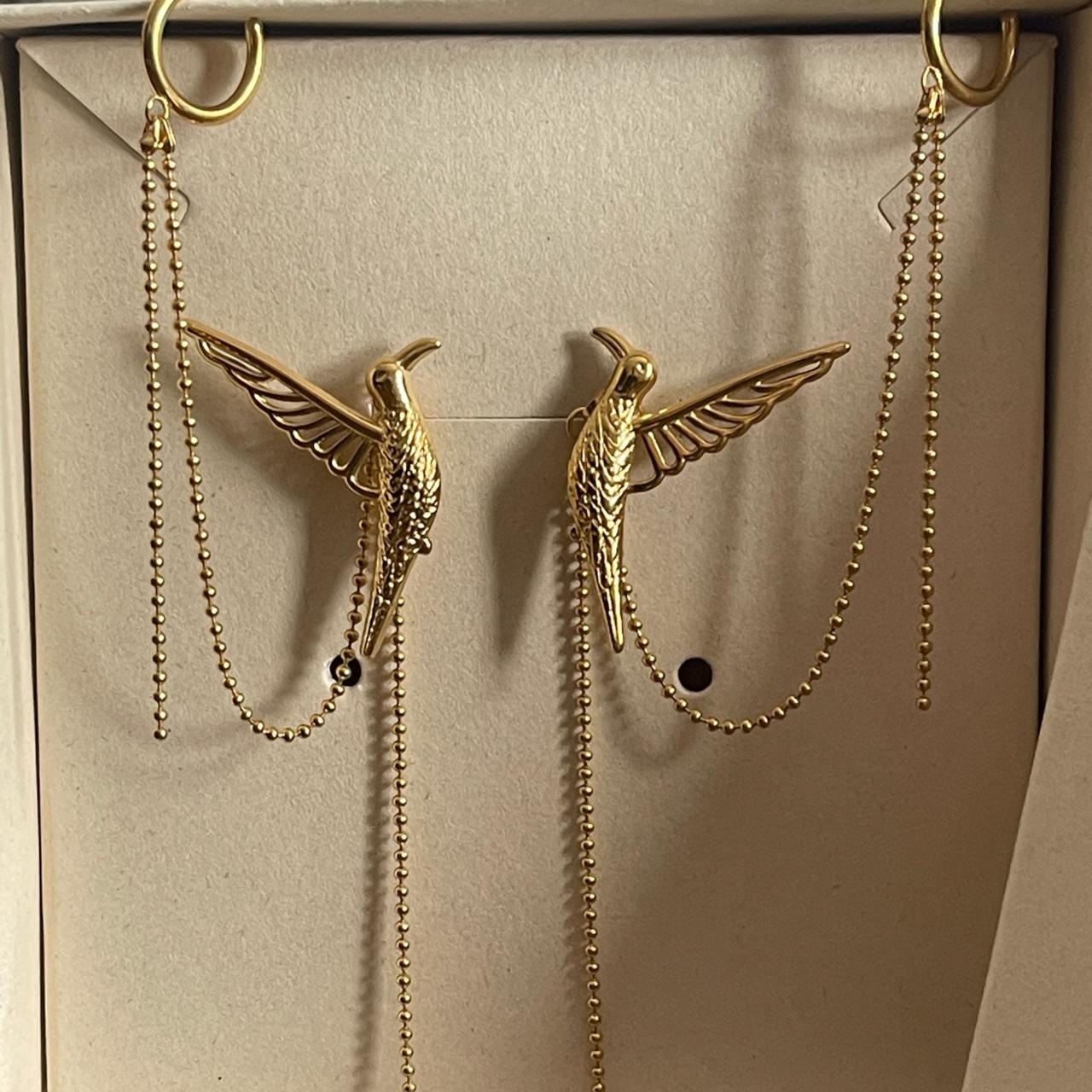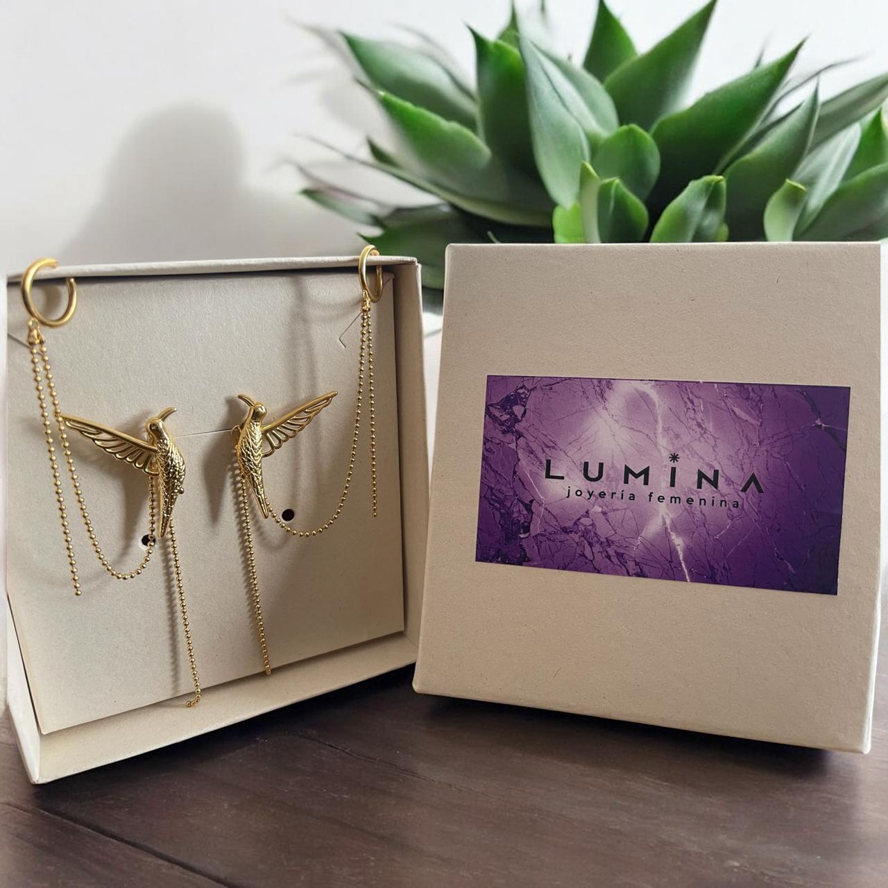 Exquisitos pájaros en vuelo, elaborados en oro laminado de 18k, con detalles que capturan su ligereza y belleza. Este diseño innovador incluye un earcuff que se ajusta elegantemente a la oreja, brindando un look audaz y sofisticado. Perfecto para quienes buscan una joya única que combine delicadeza y estilo vanguardista.